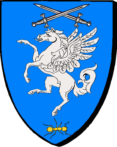 "D'azur au cheval ailé d'argent, accompagné en chef de deux épées de même, passées en sautoir et en pointe d'une fourmi d'or" "En glazur, e varc'h divaskellet en arc'hant, heuliet ouzh kab gant daou c'hleze lamellet ivez en arc'hant, hag ouzh beg gant ur verienenn en aour" Cette famille alliée aux la Haye Saint-Hilaire, Cossin de Chourses et Chastenet de Puységur, remonte à Pierre, originaire de Dieppe, établi à la Martinique en 1625. Elle a produit un capitaine de vaisseau en 1753; un officier au régiment de Noailles (dragons) en 1782 et trois chevaliers de Saint-Louis. Un membre créé baron en 1821 (PPC) |