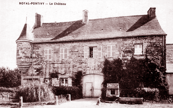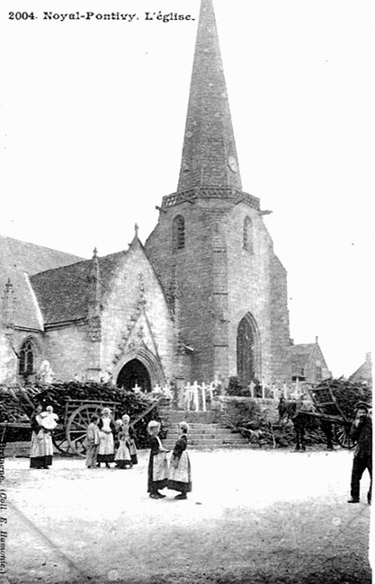 | Histoire / Istor : * Ogée (1780) : Noyal-Pontivy; à 10 lieues 1/2 au N. de Vannes, son évêché; à 18 lieues 3/4 de Rennes , et à 1 lieue 1/2 de Pontivy, sa subdélégation. Cette paroisse ressortit à Ploërmel , et compte 8000 communiants, y compris ceux de Gueltas, Kerfourne, Saint-Geran et Saint-Thuriau, ses trèves. M. le duc de Rohan en est le seigneur. La cure est à l'alternative. Ce territoire est d'une grande étendue, et plein de vallons, dans lesquels coulent des ruisseaux qui vont se décharger dans les rivières de Blavet et d'Oust. Le terroir est fertile en grains, lin et fruits : il est en partie occupé par plusieurs bois, dont le plus considérable est la foret de Branguily, et des landes très étendues. Il se tient trois foires par an à Noyal-Pontivy, savoir, celles de Noyal, de la Houssaye et de la Brolade : elles sont très-anciennes, et d'autant plus considérables, qu'elles sont franches et exemptes de tous droits d'entrée. La plus célèbre est celle de Noyal, qui se tient au commencement de juillet. On y observait jadis des coutumes singulières; nous ignorons si on les pratique encore aujourd'hui. Tout marchand qui aurait osé vendre, avant que le receveur de la vicomté de Rohan , ou autre commis du vicomte, eût porté le gant levé pour cette foire, aurait perdu toutes ses marchandises, qui étaient confisquées au profit du seigneur. On trouvait à cette foire plus de trois mille chevaux; mais on ne pouvait en vendre un seul qu'après le gant levé. Toutes ces cérémonies se faisaient au lieu accoutumé, nommé Bellechère. Les marchands faisaient ensuite passer en revue, devant le vicomte ou son commis, tous les chevaux à vendre, et il en prenait le nombre qu'il voulait, au prix fixé par son écuyer ou son maître-d'hôtel. Si quelqu'un vendait avant ces formalités, l'animal vendu était confisqué sur-le-champ au profit du vicomte, qui en disposait selon son bon plaisir. Pour le bien général de tous ceux qui étaient à la foire, le seigneur de Rohan y tenait ses plaids généraux, et l'on y jugeait toutes les causes pendantes dans les cours ou sièges du ressort de Pontivy, de Corlay, de Loudéac et de Baud. Les avocats de ces différents endroits avaient soin de s'y rendre , pour y plaider devant les juges du vicomte. Un autre avantage plus considérable, c'est que les différents ou procès qui s'élevaient entre les marchands étaient jugées sur-le-champ , de préférence à tout autre, depuis le commencement jusqu`à la fin de la foire, qui durait plus de quinze jours. Pour la sûreté des marchands et de leurs effets, le vicomte avait le droit de faire assembler tous les habitants de la paroisse, qui, pendant la nuit, accompagnaient le receveur de ce seigneur, ou autre par lui commis , pour faire le guet dans les rues et dans les endroits ou étaient les marchandises; et si quelqu'un des habitants eût refusé d'obéir, il aurait été puni, taxé et exécuté par les officiers de la seigneurie. Les seigneurs de Rohan ont eu, de tout temps, le droit et possession d'avoir, donner et tenir, par toute la vicomté , des mesures pour les cabaretiers , les marchands de blé et de draps; et aucun de ceux-ci n'aurait osé vendre une aune d'étoffe, sans avoir pris des officiers ou commis de ces seigneurs un étalon ou verge de mesure, qui leur coûtait 4 deniers par an. En 1440 , Bellechière ou BelleChère , et Kermelin , au seigneur de Rohan; Calhuerne, au sieur de Malestroit; Kerinquelon, à Jean de Kerinquelleau : ce manoir se nomme aujourd'hui Kerniquelo et appartient à M. de la Touche-Porman; il a haute , moyenne et basse-justice. Kerbourhis, à Jean de Larlan; cette terre a basse-justice et appartient à M. de Menisoille; les Fontainenez, à Jean le Bodic; Kermabo, à Guillaume de la Flaye; Kerboutier, au sieur de Lantivy; Keruer, à Henri le Parisi; Tremais, au sieur de Tremais; Kerhourhet, à Guillaume de Coëtmeur; Kerlagadeuc, à N... Lestrelan. La plupart de ces manoirs sont aujourd'hui en ruines, et n'ont que le nom de métairies. La maison de Coëttuhan , basse-justice, appartient à M. le président de Langle; et le Stan gui, à N.... * Marteville et Varin (1843) : NOYAL-PONTIVY; commune formée de l'anc. par. de