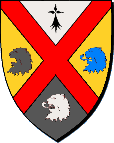 Armoiries; blason / Ardamezioù; skoed : * Froger et Pressensé (2001) : "Écartelé en sautoir : - au 1, d'argent à une moucheture d'hermine, - au 2, d'or à une tête de lion morné arrachée de sable, - au 3, d'or, à une tête de lion arrachée d'azur, - au 4, de sable à une tête de lion arrachée d'argent; sur le tout : un sautoir de gueules brochant"; Concepteur : Bernard Le Brun. ---------- * JC Even : "Palefarzhet ha lammellet : - ouzh 1, en arc'hant e vrizhenn erminig, - ouzh 2, en aour e penn leon kudennek diframmet en sabel, - ouzh 3, en aour e penn leon diframmet en glazur, - ouzh 4, en sabel e penn leon diframmet en arc'hant - a-greiz : ul lammell en gwad balirant" |
