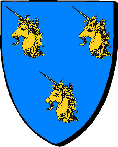 "d'azur à trois merlettes d'or" / "en glazur e deir voualc'henn en aour" - Charles, conseiller au Parlement de Bretagne en 1566 - Claude, conseiller au Parlement de Bretagne en 1568 |