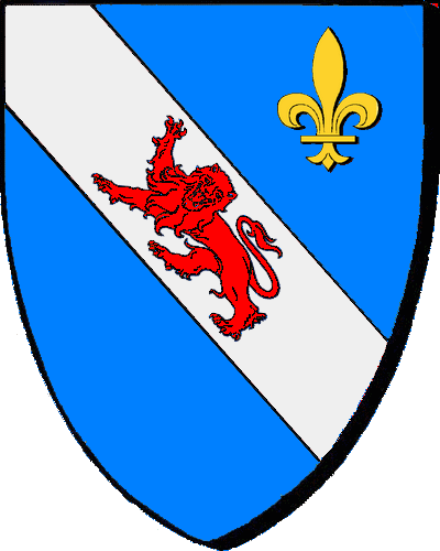 "d'azur à la bande d'argent chargée d'un léopard de gueules, et surmontées d'une fleur de lys d'or"