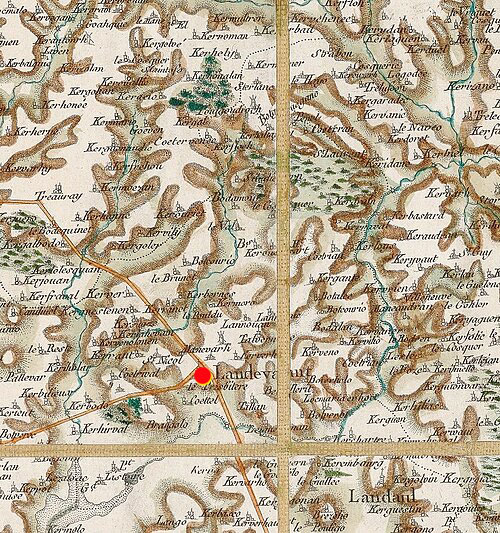 | Histoire / Istor : * Ogée (1780) : Landevan :, sur la route d'Auray à Hennebon; à 6 I. I/2 de Vannes, son évêché; à 2131. 4/,, de Rennes, et à 31. d`Auray, sa subdélégation et sou ressort. Cette paroisse, dont la cure est à l'alternative, relève du roi, et compte 1500 communiants. Il s'y tient quatre foires par an, lesquelles durent onze jours. Son territoire est coupé de ruisseaux qui coulent dans les vallons; les terres en sont bien cultivées et les landes rares. — Auprès du village Rivalon, situé dans cette paroisse, paraît une mine de plomb, qui semble fort abondante en métal; mais on n'a point encore fait de préparatifs pour son exploitation. — Ce territoire renfermait les maisons nobles suivantes : en 1430, le manoir de Botalant, à Maurice de Plousquen; Margozre, à Henri Thomason; Coetalhuet, à Alain Talhoët; en 1520, la maison noble de Duval, au sieur de Coëbic; la Nouan, au sieur du Garo; Kerrouaud, à Guillon de la Haye; Kerbodo, à François de Kermoro; KKerlazenaen à Julien le Boulbic. * Marteville et Varin (1843) : LANDEVANT (sous l'invocation de saint Martin) : commune formée de l'anc. par. de ce nom; aujourd'hui