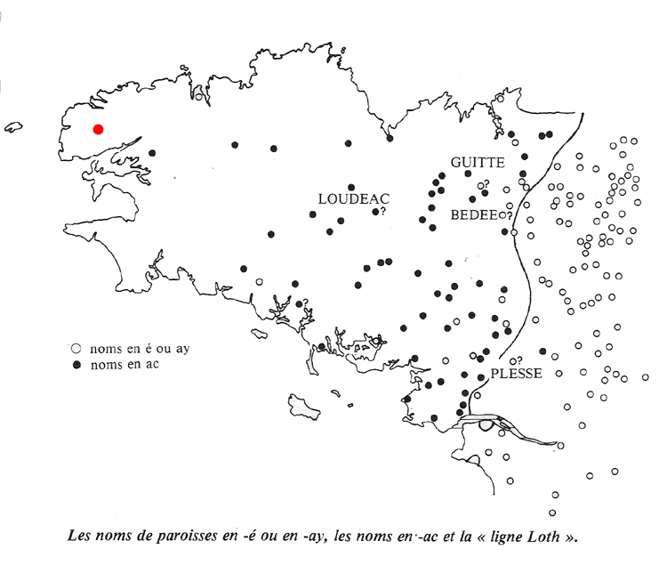 Carte André Chedeville et Hubert Guillotel. Repérage des toponymes en -ac. Le point rouge est celui de Milizac (J.-C. Even. 27.11. 2025) ----------