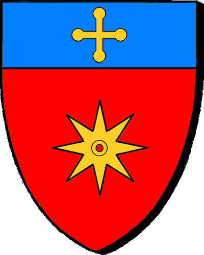 Famille d'Aussonvilliers : Originaires de Normandie. seigneurs dudit-lieu; barons de Courcy en Normandie. Seigneurs de Flémorbé, en Mélesse; des Navinaux en Vertou; de la Tour, en Port-Saint-Père. "d'azur au sautoir d'or, cantonné de quatre étoiles de même" / "en glazur e lammell en aour, ur steredenn ivez en aour ouzh pep konk". (PPC) |