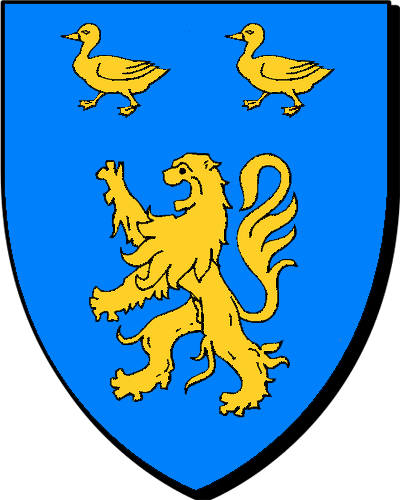 BOUIN; seigneurs de Rains, de Cacé, paroisse de Saint-Gilles, évêché de Rennes. "D'azur au lion morné d'or, accompagné en chef de deux canettes de même" / "En glazur e leon kudennek en aour, heuliet gant div houadan ivez en aour" - Germain, garde des livres des Comptes et 1601; - François, maître des Comptes en 1673. - François-Georges, seigneur de Cacé, président de la Chambre des Comptes de Bretagne, à Nantes, en 1724; - François-Anne, seigneur de Cacé, président de la Chambre des Comptes de Bretagne, à Nantes, en 1739; décédé en charge. |