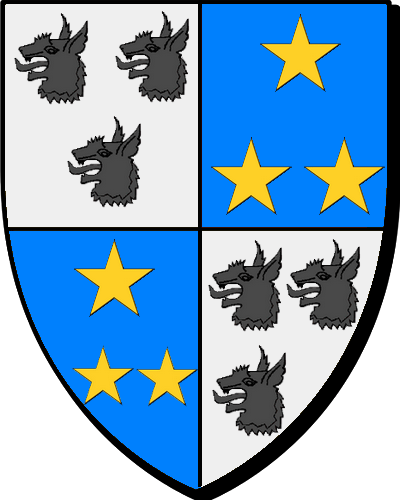 "d'argent à la bande de sable, accompagnée de deux besants de gueules" "en arc'hant e sourin en sabel, heuliet gant div bezantenn en gwad" - Vincent, conseiller au Parlement de Bretagne en 1632, puis procureur général syndic des États, décédé en 1642. Marié 1° à Maria la Vallée, 2° à Catherine de Guermel. |