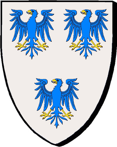 Originaire du Poitou. Seigneuries non indiquées. "d'argent au chevron de sable, accompagné en chef de deux merlettes de même et en pointe d'un d'un croissant de gueules" "en arc'hant e gebrenn e sabel, heuliet ouzh kab gant div voualc'henn ivez en sabel, hag ouzh ben gant ur greskenn en gwad" - Gautier, juge et lieutenant général de la sénéchaussée de Châtelleraut, conseiller au Parlement de Bretagne en 1554 (décédé en 1558). Armorial 1696. (PPC) |