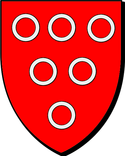ROSCERF (DE), seigneurs dudit lieu, du Bois-de-la-Roche, de Runancrec'h et de Hentargoat, par. de Coadout; de Coëtnizan. Réf. et montres de 1481 à 1543, par. de Coadout. év. de Dol. "De gueules à six annelets d'argent, 3. 2. 1" / "En gwad e c'hwec'h ruilhenn en arc'hant, 3, 2, 1" (Sceau / Siell 1416). - Pierre, chambellan du duc François II, puis d'Anne de Bretagne, depuis 1480. Fondu en 1526 dans Du LISCOËT. |