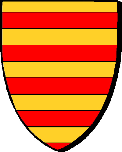 RUFFELET, seigneurs de la Villeméen et de la Grenouillère, par. de Ploufragan; de Clairefontaine, par. de Plérin; de la Ville-Hingant, du Chalonge, par. de Saint-Michel de Saint-Brieuc; de la Lande, de la Villebaud. Déb., réf. 1669; réf. 1535, par. de Ploufragan, év. de Saint-Brieuc. "Burelé d'or et de gueules de dix pièces" / "Goudreustellet etre aour ha gwad a zek pezh" (G.le B). - Salomon, sénéchal de Saint-Brieuc en 1598, anobli en 1614. |